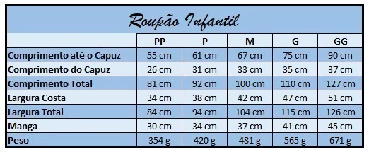 Confeccionado em 100% algodão com tecido felpudo, o roupão proporciona um toque suave e aconchegante, perfeito para a pele delicada das crianças. O capuz conta com acabamento interno em malha penteada fio 30 e viés tricoline, garantindo costuras limpas, resistentes e duradouras.